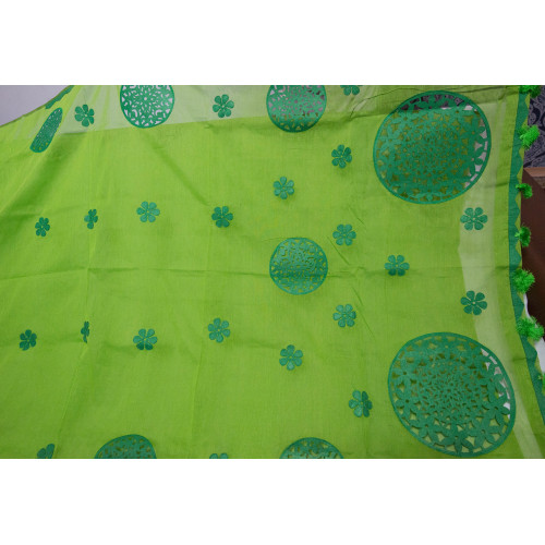Green Cotton Saree with Green Aplik and Cutworks and Achal/Pallu has beautiful Tassels. Saree has no Blouse piece.