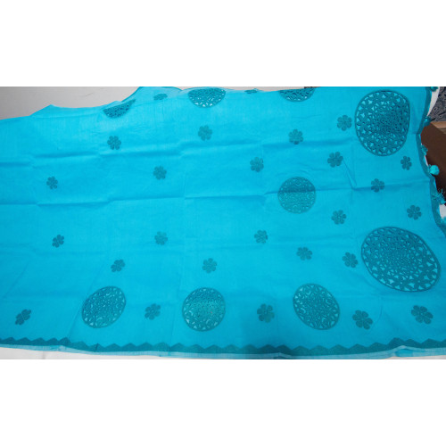 Skyblue Cotton Saree with Skyblue Aplik and Cutworks and Achal/Pallu has beautiful Tassels. Saree has no Blouse piece.